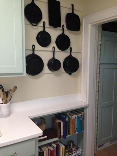 The renovation: To display my client’s collection of cast iron skillets, her carpenter reinforced the sheetrock with wooden boards to mount the pans.