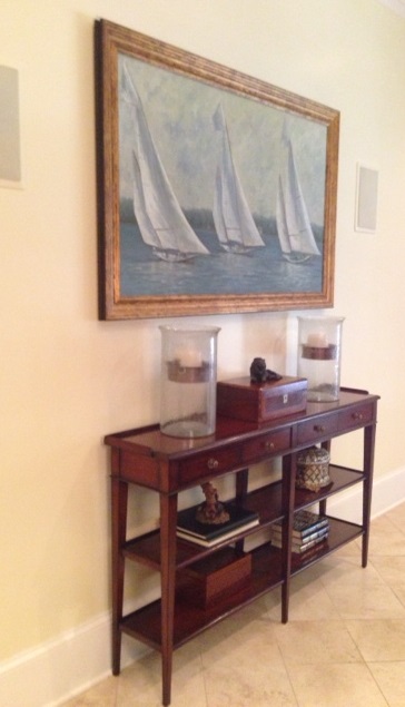 The upright piano was moved out and replaced with a console table with shelves – a new home for books and decorative accessories. Over it we removed the traditional oil painting and instead hung a more updated painting of sail boats.