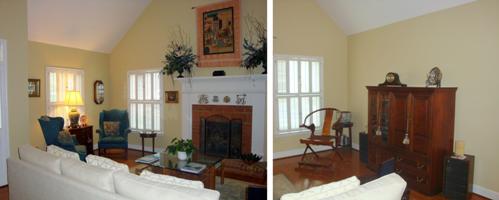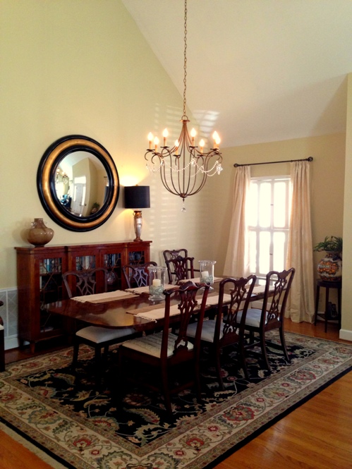 In the dining room, which is open to the living room, the small chandelier was dwarfed by the large space and was hung off center in the room, making it awkward and cramped. The new, larger chandelier centered in the space has opened up the room and connected it to the overall living area.